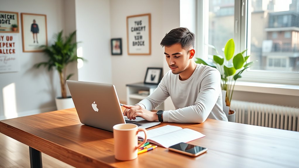 To manage your time effectively as a freelancer, prioritize tasks with clear deadlines and set a daily schedule. Use tools like calendars and timers to stay focused, ensuring you allocate time for work and personal life. Practicing good time management helps you maintain work-life balance, preventing burnout. Remember, sticking to your schedule and setting boundaries allows you to stay productive while also enjoying your personal time.