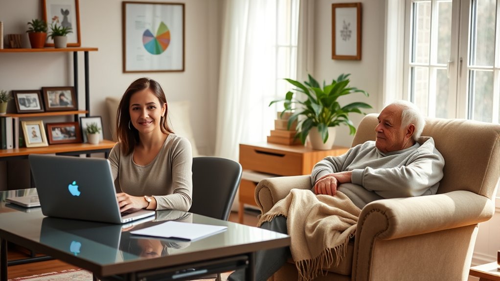 You can make money online while caring for elderly relatives by choosing flexible jobs like virtual assistance, content writing, or customer service that let you set your hours around caregiving. Starting an online business or hobby-based side gig, such as selling crafts or offering coaching, also offers income on your schedule. Using routines and support networks helps you stay organized and balance responsibilities. If you keep exploring, you’ll discover how to combine work and caregiving effectively.