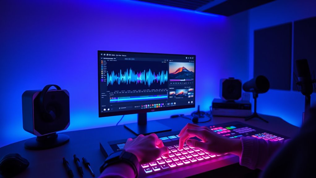 AI-enhanced video and podcast editing services help you create professional content quickly and easily. These tools automate tasks like background replacement, effects, and captions, saving you time and effort. They analyze your footage to suggest edits, optimize quality, and streamline your workflow. With user-friendly interfaces and access through online platforms, you can produce high-quality content without expensive equipment or technical skills. Keep exploring to discover how these innovations can elevate your projects.