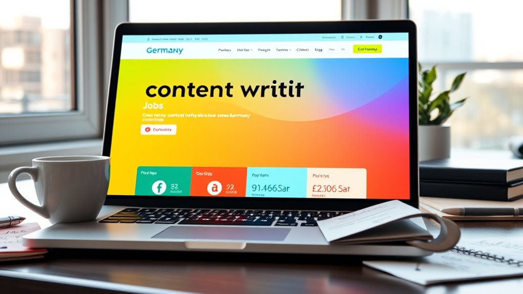In Germany, you’ll find plenty of content writing opportunities on platforms like Upwork, Freelancer, Fiverr, Content.de, and Textbroker Germany. Pay rates start around €0.05 to €0.10 per word for beginners, while experienced writers can earn €0.20 or more, especially in niches like finance or tech. Fluency in German is often required, but English content is also in demand. To discover the key tips and strategies for success, keep exploring what’s available.