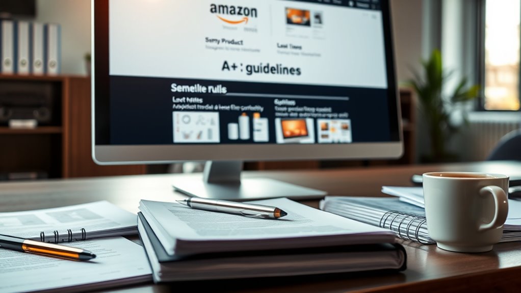 If you want to maximize your product listings on Amazon, understanding their A+ Content rules is vital. This feature allows you to enhance your product pages with detailed descriptions, high-quality images, and compelling storytelling. However, Amazon has strict guidelines to guarantee consistency and quality across listings. Ignoring these rules can lead to costly rejections, delaying your product’s visibility and sales. One of the most essential aspects to master is the product image guidelines. Amazon requires images to be clear, professional, and accurately represent the product. Avoid using overly promotional or exaggerated visuals, as these are prohibited. Instead, focus on high-resolution images that showcase different angles, features, and uses. Text overlays on images are generally discouraged unless they comply with specific standards, so keep visuals clean and straightforward.