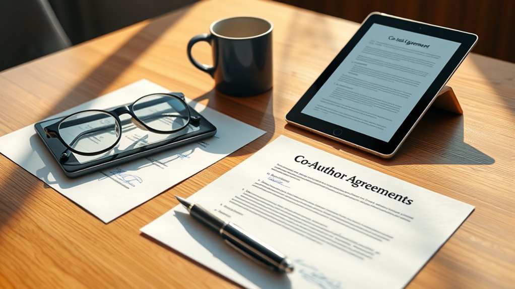 A co-author agreement helps protect your intellectual property by clearly defining ownership, roles, and rights of each collaborator in your Kindle project. It guarantees everyone agrees on decision-making, profit sharing, and licensing, preventing disputes later. This document safeguards your contributions and outlines how the work can be used or adapted. Staying aware of these essential points will guide you through establishing a strong, legally sound partnership for your project’s success.