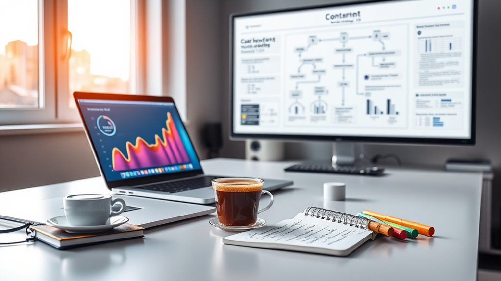 You can use tools like a content audit platform to regularly review your content’s performance and identify gaps. Combining this with competitor analysis helps you see what’s working in your niche. These tools provide insights into keywords, engagement, and rankings, allowing you to adapt your helpful content strategies effectively. By monitoring these metrics, you guarantee your content remains relevant and continues to improve your long-term Google rankings.