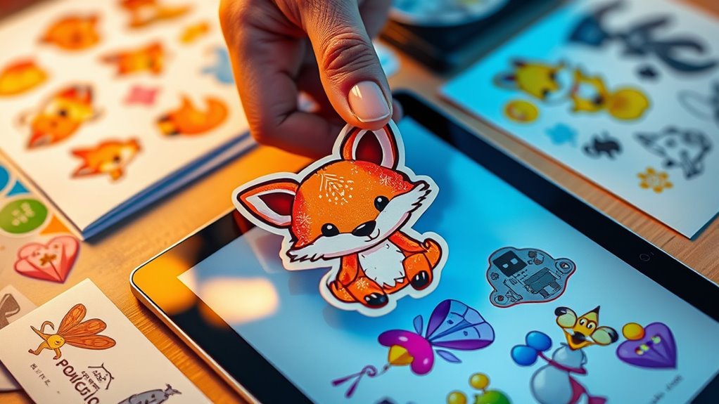 Turning digital illustrations into stickers and decals is a creative way to bring your artwork to life and share it with others. The first step involves understanding the various printing techniques available to produce high-quality, durable stickers. Depending on your needs, you might choose digital printing for vibrant colors and detailed images or screen printing for larger quantities and thicker finishes. Each printing technique offers different advantages, so knowing which one suits your project guarantees your stickers look professional and last over time. Once you’ve settled on a printing method, you’ll need to prepare your digital files correctly. This is where design software becomes essential. Programs like Adobe Illustrator or Photoshop allow you to create and refine your designs with precision, ensuring clean lines, proper color profiles, and the right resolution for printing. Using vector-based design software is often recommended because it allows your artwork to scale without losing quality, which is vital when resizing for various sticker sizes or decals. Additionally, understanding the importance of skin-friendly materials can help ensure your stickers are safe and comfortable for all users.