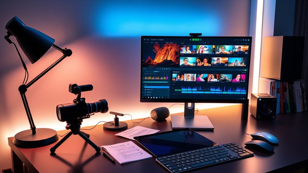 To choose the right video editing software for your brand, start with a thorough software comparison, focusing on feature considerations like ease of use, editing tools, and compatibility with your devices. Think about your specific needs—whether you require advanced effects or simple trimming. Try free trials to see which interface feels most intuitive and meets your workflow. This approach helps you find a tool that enhances your content without unnecessary complexity.