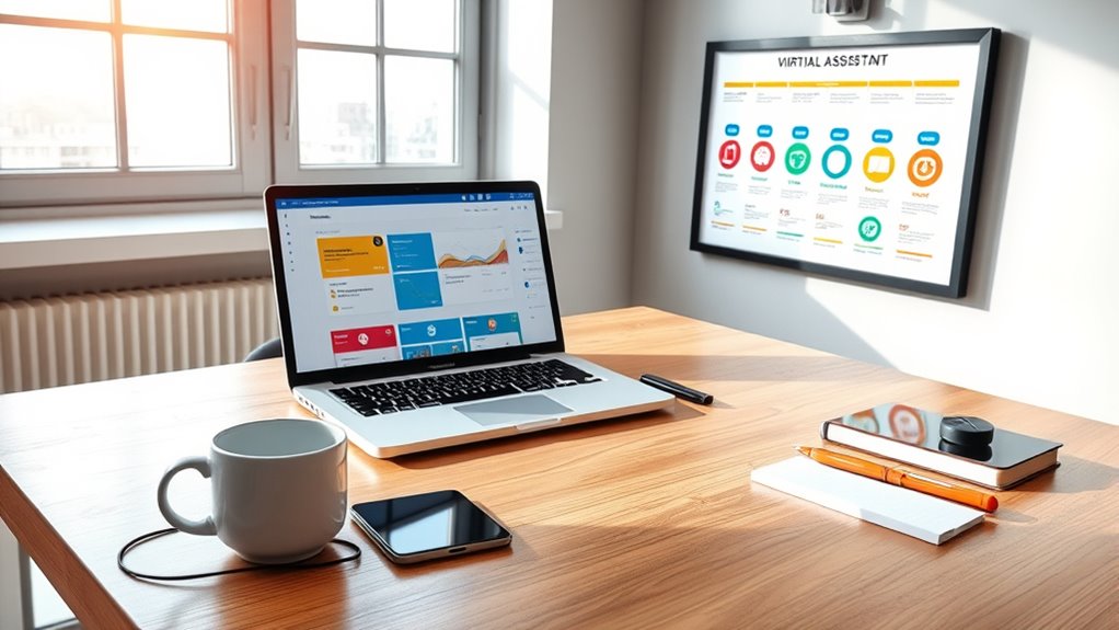 Getting certifications like the Certified Virtual Assistant (CVA), Microsoft Office Specialist, or Google Workspace Certification can substantially boost your credibility. These credential enhancements demonstrate your skills and commitment, making clients trust you more. By earning relevant certifications, you show you’re dedicated to professional growth, which ultimately enhances your credibility boosting as a virtual assistant. Keep updating your credentials regularly to stay competitive and build long-term client relationships.