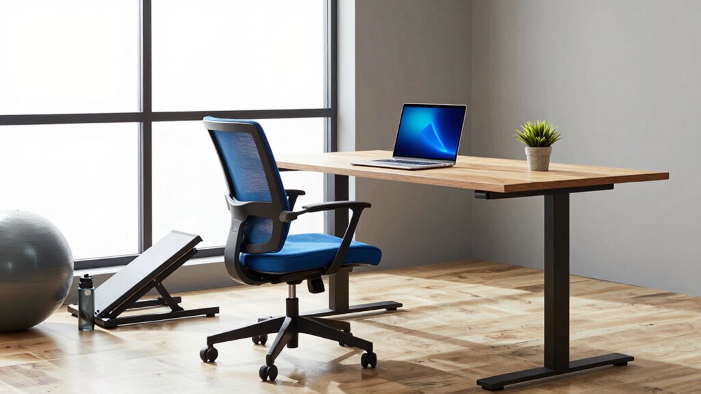 Setting up your desk correctly can make a significant difference in reducing strain and improving your posture. Start by adjusting your chair and desk height so your feet are flat on the floor and your knees are at a 90-degree angle. Use ergonomic accessories like lumbar supports or keyboard trays to support proper alignment. Invest in adjustable furniture to customize your workspace for comfort and flexibility. This guarantees your monitor is at eye level, preventing neck strain. Keep essentials within easy reach to avoid overextending. Proper setup not only reduces discomfort but also boosts productivity by creating a healthier workspace.
