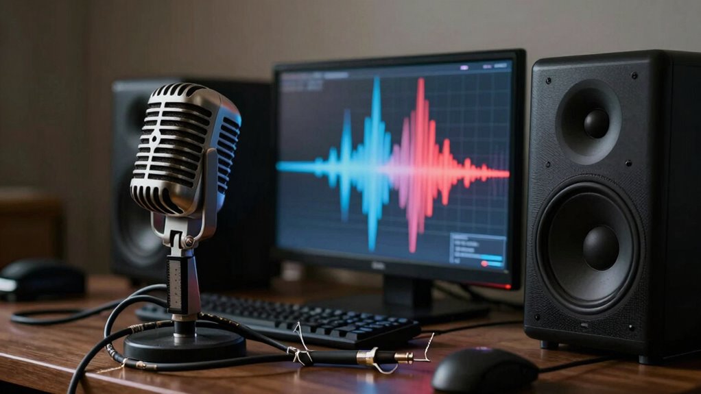 Think of microphone placement as planting a seed for crystal-clear sound. Proper placement guarantees your voice blooms with clarity. Using the right microphone types, like cardioid mics for focused sound, and sound isolation techniques, like foam shields, helps prevent background noise. When you position your mic correctly, you’re nurturing an audio environment that captures your voice’s true essence, making your content more engaging and professional.