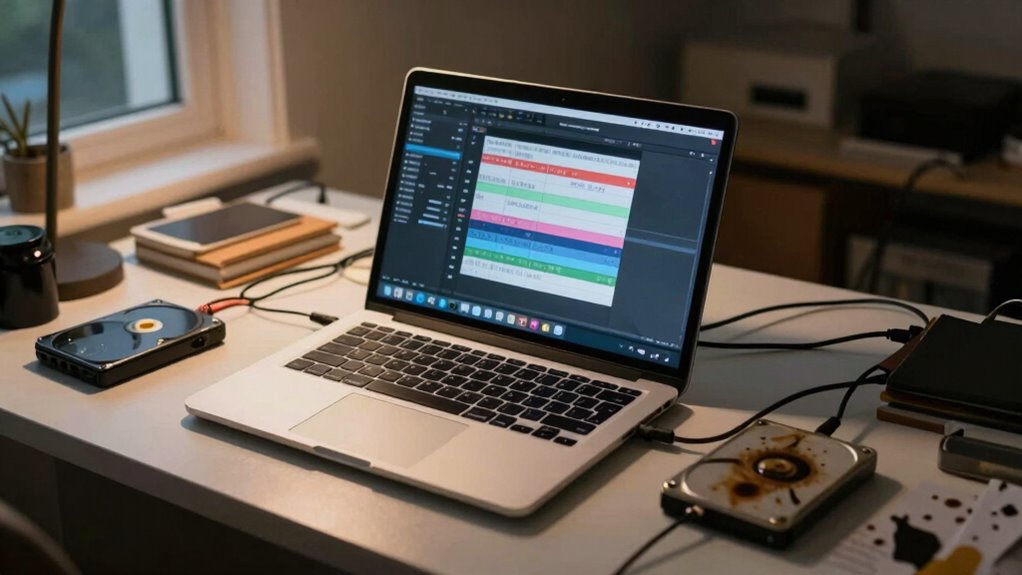 Having enough storage and RAM is essential for guaranteeing smooth editing sessions. Insufficient space causes constant slowdowns, while limited RAM hampers multitasking and real-time preview rendering. To optimize storage, consider options like SSDs for faster access and external drives for added capacity. For RAM, look into upgrade options that match your laptop’s compatibility to boost performance. Prioritize these key points: