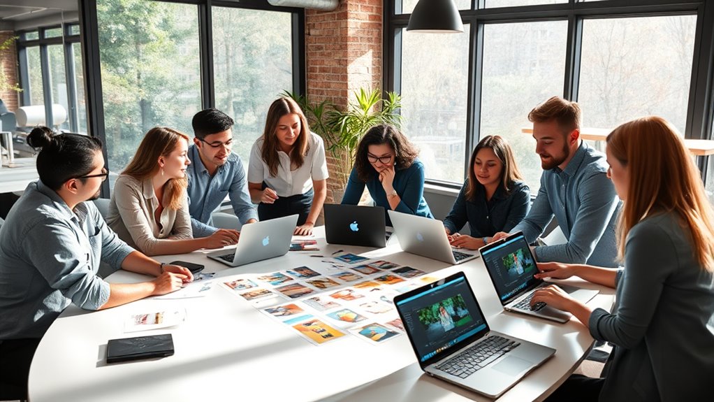 To build a team for outsourcing editing and thumbnails, start by choosing the right collaboration tools like Slack or Trello to streamline communication and task management. Clearly define roles, responsibilities, and workflows to keep everyone aligned. Maintain regular check-ins and foster open dialogue to guarantee quality and deadlines are met. Using comments and annotations helps with precise feedback. To learn more about creating a cohesive team system, see what strategies work best.