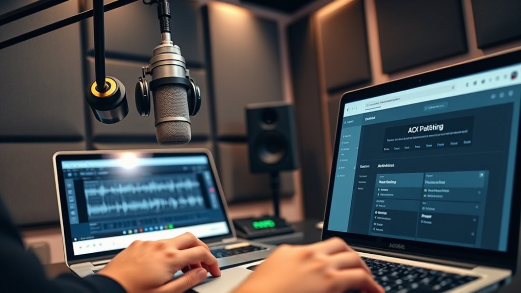To sell audio content on Audible’s ACX platform, you need to understand your royalty options, distribution rights, and production choices. You can choose between a 50% royalty split for self-produced audiobooks or higher rates when collaborating with a professional. Deciding on exclusive or non-exclusive rights impacts your earnings and distribution reach. Mastering these aspects helps maximize your profits. Keep exploring further, and you’ll uncover more tips to optimize your audiobooks’ success.