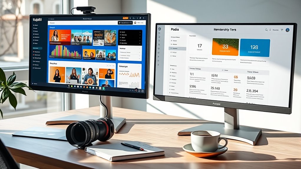 When choosing between Kajabi and Podia for online courses and memberships, consider your budget and growth plans. Kajabi offers advanced customization, automation, and scalability but comes at a higher cost. Podia provides a simpler, more affordable platform ideal for beginners, though it may lack some features as your business grows. To make the best choice, weigh your current needs against your long-term goals—more details ahead can help you decide.
