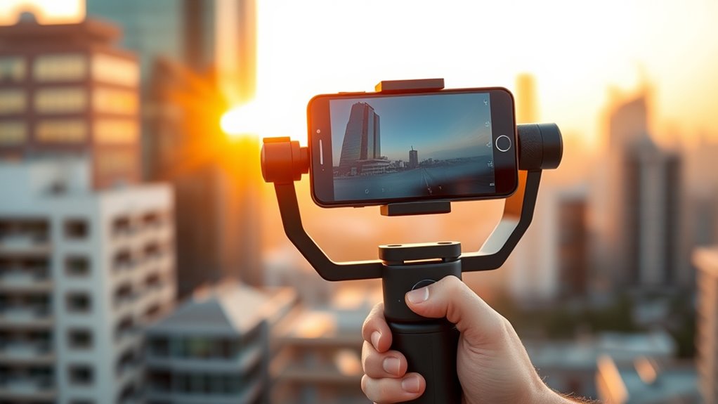 If you’re looking to boost your mobile filmmaking in 2025, I recommend exploring the top 15 counterweight phone stabilizers. These devices help balance your smartphone and external gear, ensuring smooth, professional footage even during action shots. Many options support popular gimbals like DJI Osmo Mobile and hohem iSteady X3 SE, with lightweight, portable designs. To find the perfect fit for your needs and learn more about these innovative tools, keep exploring further.