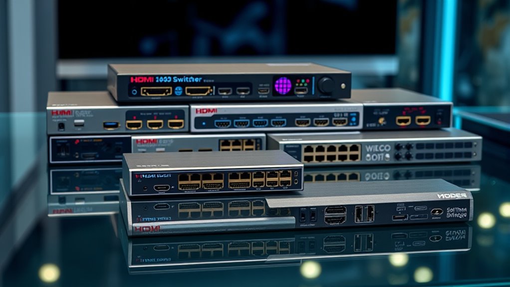 Choosing the right HDMI switcher feels like assembling a symphony of seamless connections, each instrument playing in harmony. As you navigate this tech landscape, picture smooth streams flowing effortlessly like a crystal-clear river, unbroken and vibrant. With the right switcher, your setup becomes a fluid dance of devices, transforming chaos into clarity. Trust me, when everything syncs perfectly, it’s like watching your digital world come alive with effortless grace.