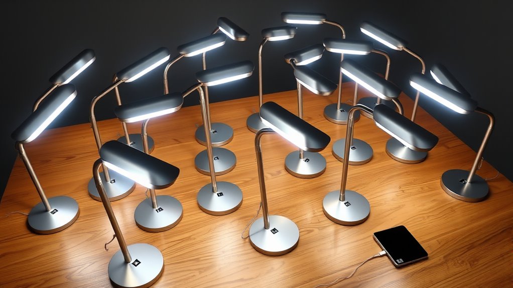 When selecting an LED desk lamp, flexibility and adjustability are essential for creating a comfortable and efficient workspace. A good lamp lets me modify the angle, height, or direction of the light to match different tasks and reduce glare. Features like goosenecks or swivel joints enable precise positioning, helping me avoid neck or eye strain. Multi-directional adjustments, such as 180° or 360° rotation, give me full control over lighting focus and coverage. Dimmable options and adjustable color temperatures allow me to customize brightness and ambiance for work or relaxation. Additionally, a lamp with foldable arms or telescoping sections makes storage and transportation easier. Overall, high flexibility ensures I can adapt my lighting setup effortlessly to my needs.
