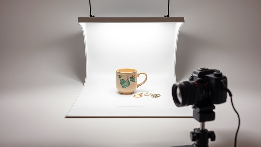 Think of it like tuning a guitar; the right settings depend on your product’s nature. For shiny items, dial down the brightness and increase diffusion to avoid glare. For matte products, boost the light slightly to highlight texture. Use a tripod for stability, and experiment with white balance to match your environment. Adjust exposure and ISO to get crisp, vibrant images that showcase your product’s best features.