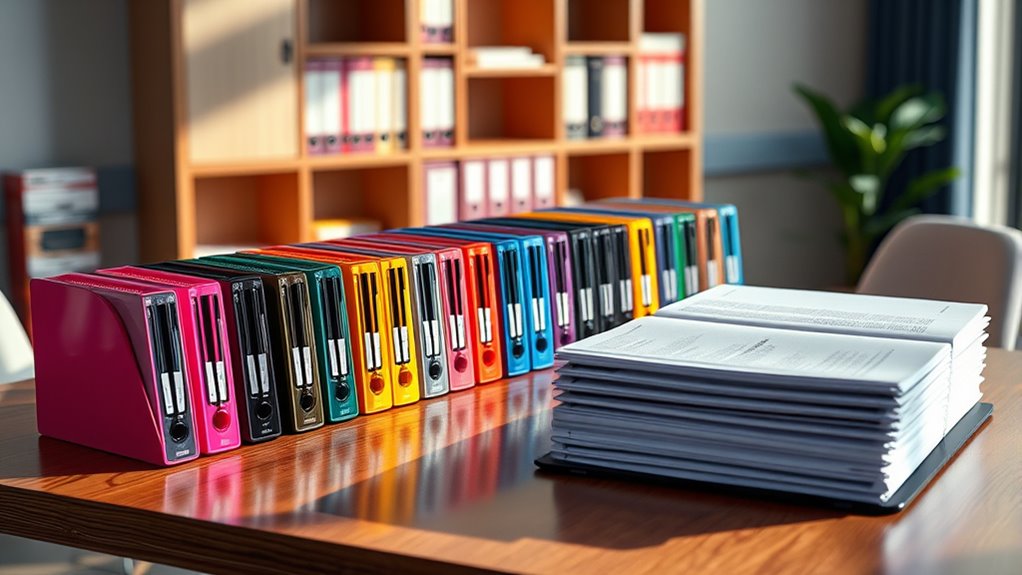 How much you spend on a plastic‑comb binding machine and its replacement spines can considerably impact your overall costs and workflow. Basic models start around $50, while more advanced units can exceed $300. Replacement spines are usually sold in packs of 50 to 100, costing between $10 and $30 per pack, depending on size and brand. Larger spines that hold more sheets tend to be pricier, but buying in bulk can save you money if you have frequent binding needs. Compatibility is key—make sure the spines fit your machine’s size and hole pattern to avoid hassles. Balancing upfront costs with the price of replacement spines helps you choose a machine that fits your budget and ensures smooth, cost-effective operation over time.