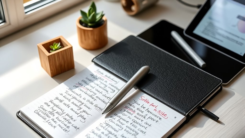 Did you know that over 300 million notebooks are discarded annually? I’m glad to share that many reusable smart notebooks are made with eco-friendly materials like recycled paper, biodegradable plastics, and sustainable fabrics. These choices markedly reduce waste and environmental impact. As someone passionate about sustainability, I appreciate how brands prioritize eco-conscious manufacturing, making it easier for us to stay organized while caring for the planet.